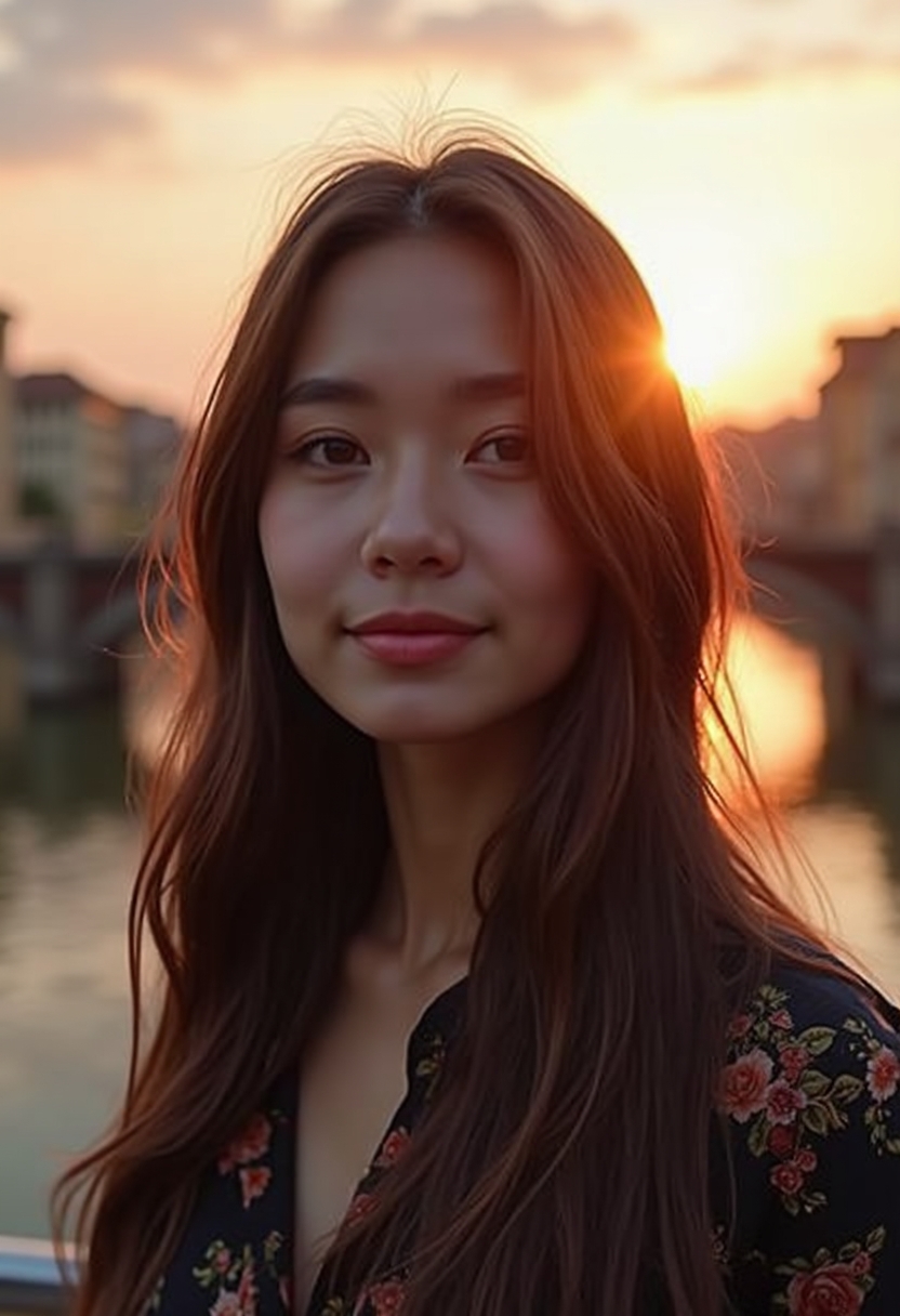 Флоренциядағы әйгілі Понте Веккьо көпірінің үстінде тұрған адам, кешкі күннің қызғылт-сары шуағы оның артында жарқырауда. Оның көзқарасы дәл камераға бағытталған, айналасында суретке түсететін алтын қаланың көріністері. Киімі сәнді, заманауи итальян стилінде.