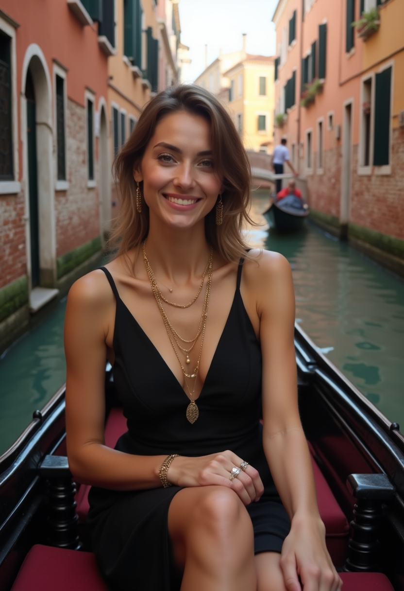 Фотода Венециядағы тар канал бойымен сырғып бара жатқан гондолада отырған әйел бейнеленген. Атмосфераны күн сәулесі жайлап жарықтандырып тұр, бұл көрініске жылылық пен тыныштық сыйлайды. Әйел босаңсып, риза күйде отыр, жүзінде жеңіл жымиыс бар. Үстінде – сәнді қара көйлек. Мойнында бірнеше алтын алқа, білегінде – білезік, саусақтарында жүзіктер жарқырайды. Шашы жеңіл жиналып, бет-жүзін ашық көрсетеді. Артқы фонда – түрлі түсті қасбеттері бар көне ғимараттар, тар көпірлер және архитектураны бейнелеп тұрған тыныш канал суы. Алыстан тағы бір гондола мен гондольер көрінеді. Жалпы көрініс – Венецияның романтикасы мен сұлулығын жеткізетін тыныш әрі көркем сәт.