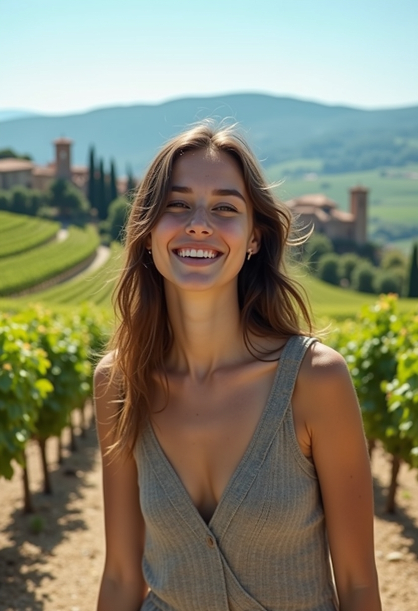 Фотосессия Италияның керемет пейзаждарында өтуі керек: көгілдір аспан астында орналасқан ыстық күндегі Тоскана алқаптарының бірінде. Бір адам камераға күлімсіреп, стильді киімде тұр. Оның артында кең жасыл жүзімдіктер көкжиекке дейін созылып жатыр, ал алыста орта ғасырлық шағын қала көрінеді. Итальян сәулет өнерінің әсемдігі мен табиғаттың тыныштығы адамның бет-бейнесіндегі қуанышын және еркіндігін айқын көрсетеді. Бұл көрініс Италияның әсемдігін және адам рухын бейнелейді.