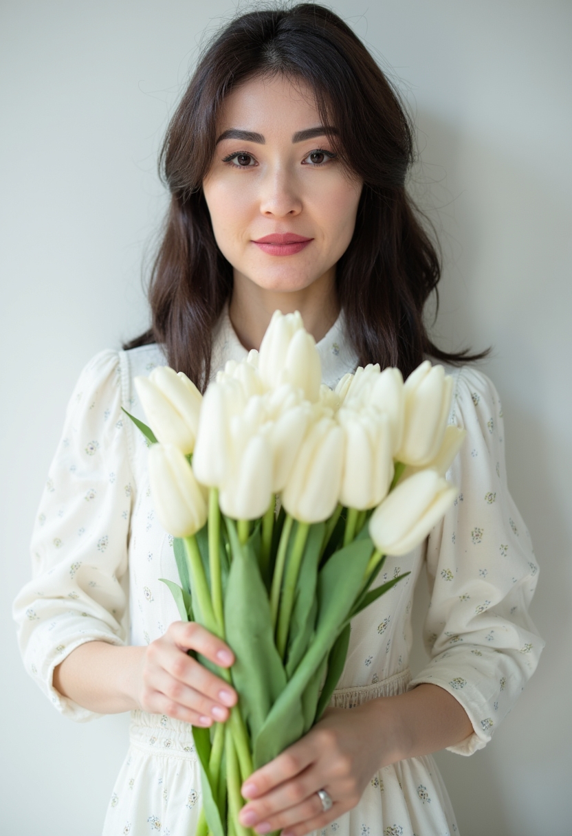 Фотостудияда таза ақ қабырға алдында ашық иықты, көлемді жеңдері бар ұсақ гүлді өрнекті ақ көйлек киген әйел үлкен ақ қызғалдақтар шоғын құшақтап тұр. Шашы ұқыпты толқынмен төселген. Ол камераға қарап, жеңіл макияжбен күлімсірейді.
