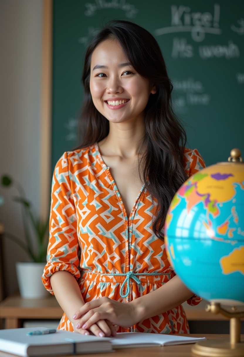 Геометриялық өрнегі бар ашық түсті көйлек киген мұғалім глобус пен оқу құралдарының жанында тұр. Ол жымиып, еркін күйде поза ұстаған. Жақын жоспар, мейірімді әрі харизмалық ұстаз бейнесі.