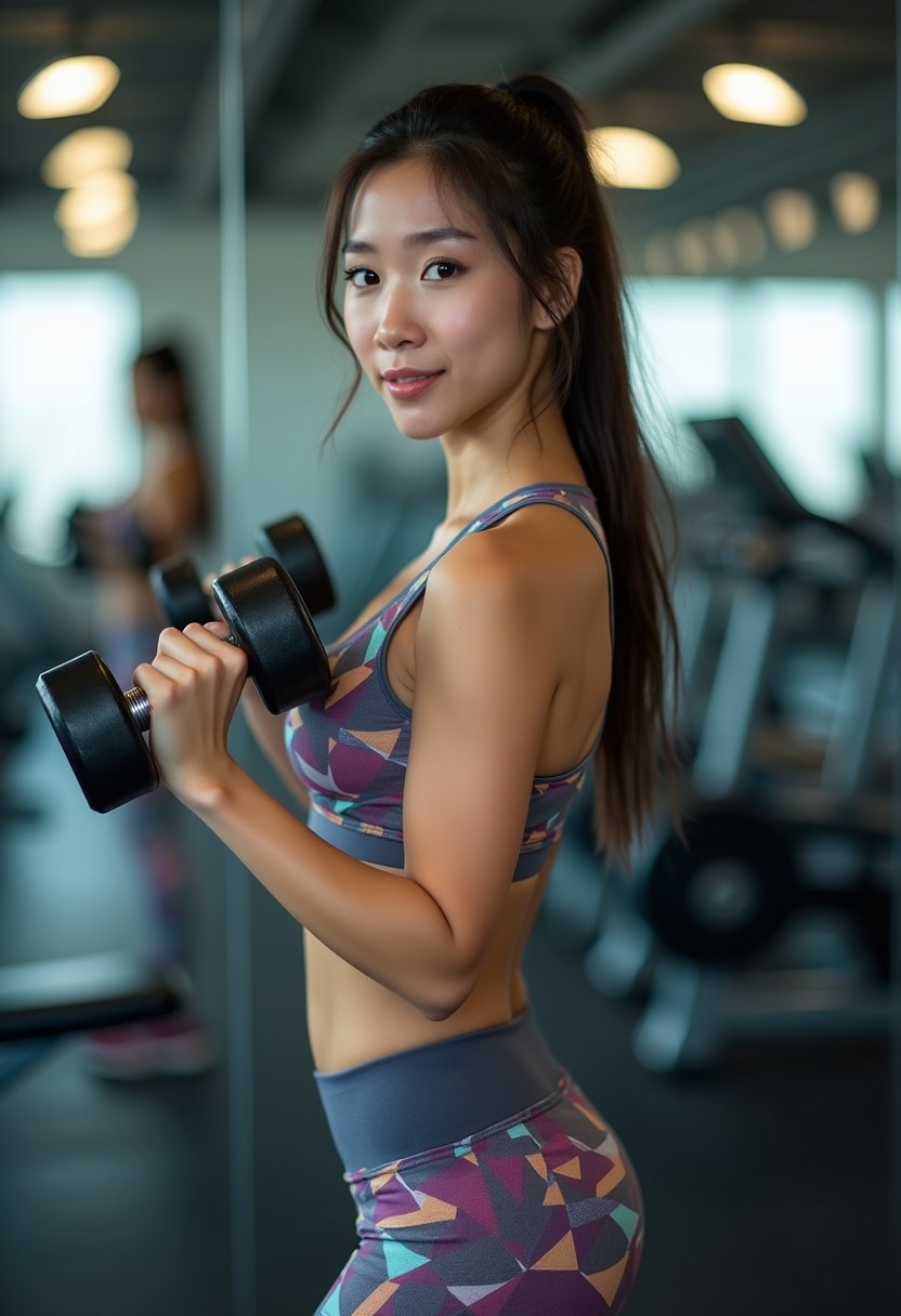 Геометриялық өрнегі бар жарқын спорт топы мен легинс киген әйел айна алдында спорт залында тұр. Ол қолында гантель ұстап, камераға сенімді күлкімен қарайды. Артында жаттығу құрылғылары мен жарқын жарық көрінеді. Екпін оның дене пішіні мен энергиялы бейнесіне қойылған.