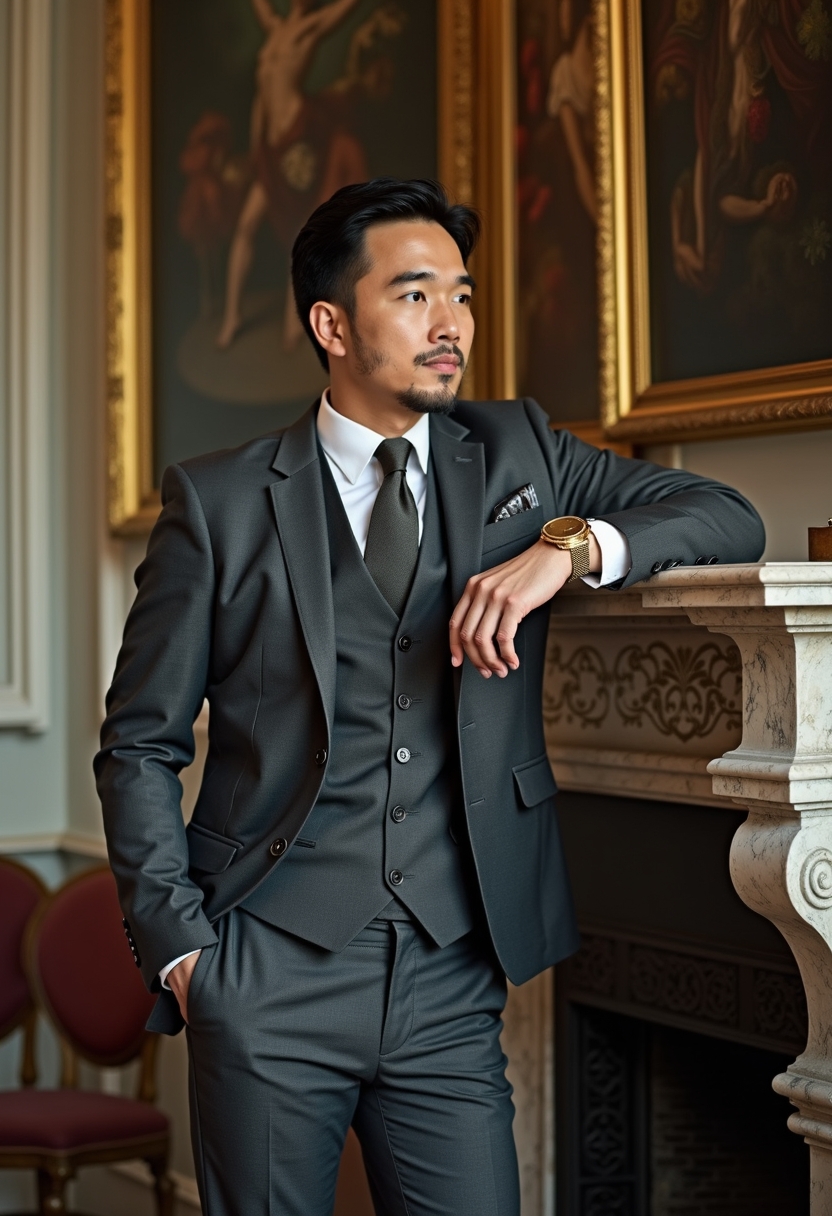 Графит түстес костюм, жилет және қолында алтын сағат таққан ер адам мәрмәрмен безендірілген ескі каминнің жанында тұр. Ол бір қолымен камин сөресіне сүйеніп, бір жаққа қарап тұр. Артқы жағында әдемі картиналар мен декор элементтері көрінеді. Жылы жарық, оның талғампаздығына назар аударылған.
