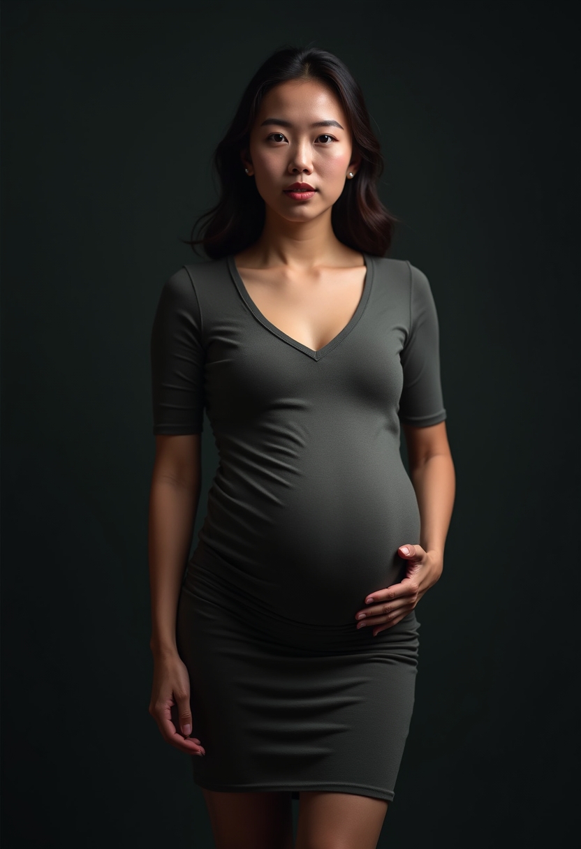 Графит түсті тар көйлек киген жүкті әйел қара минималистік фон алдында тұр. Оның беті жұмсақ бүйір жарықпен жарықтандырылған, көлеңкелер градиент құрайды, ал іш айқын көрінеді. Бір қолы ішінде, екіншісі кеудесіне қойылған. Үлкен кадр, дене сызықтары мен көлеңкелерге екпін қойылған.