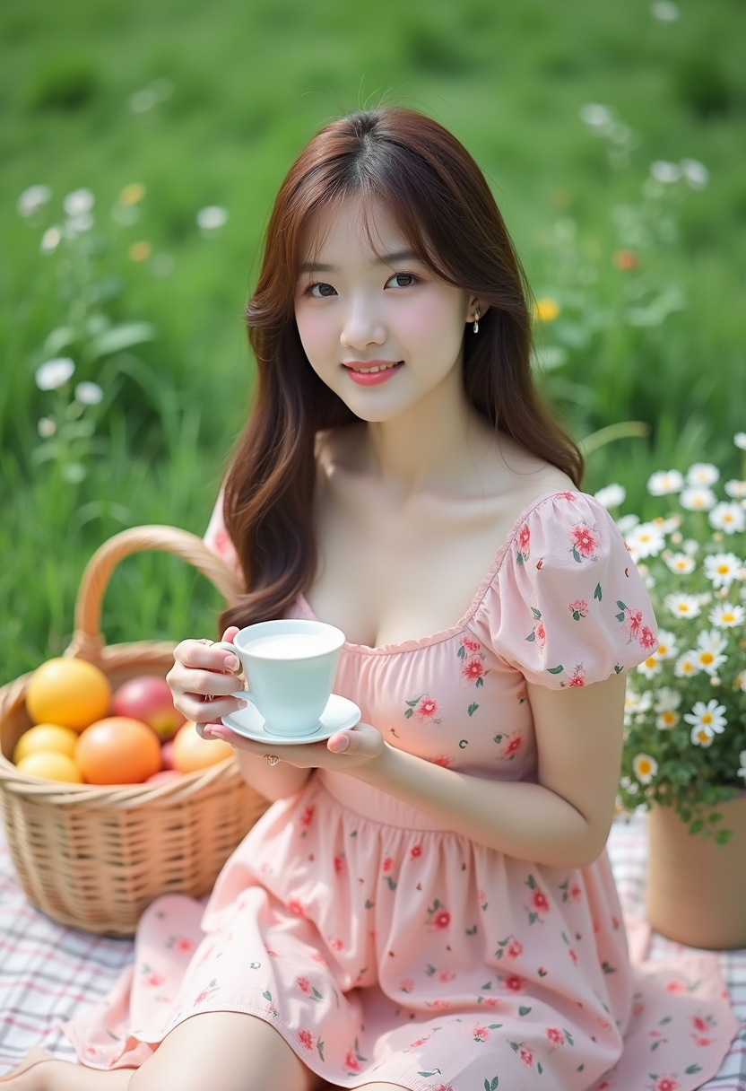 Гүлді өрнегі бар ашық қызғылт көйлек киген әйел гүлдер қоршаған пикник төсеніші үстінде отыр. Қолында шай кесесі, ал көзі тікелей камераға бағытталған. Артында жеміс салынған себет пен жасыл көгал көрінеді. Табиғи жарық, екпін оның жайлылығы мен көктемгі атмосферасына қойылған.