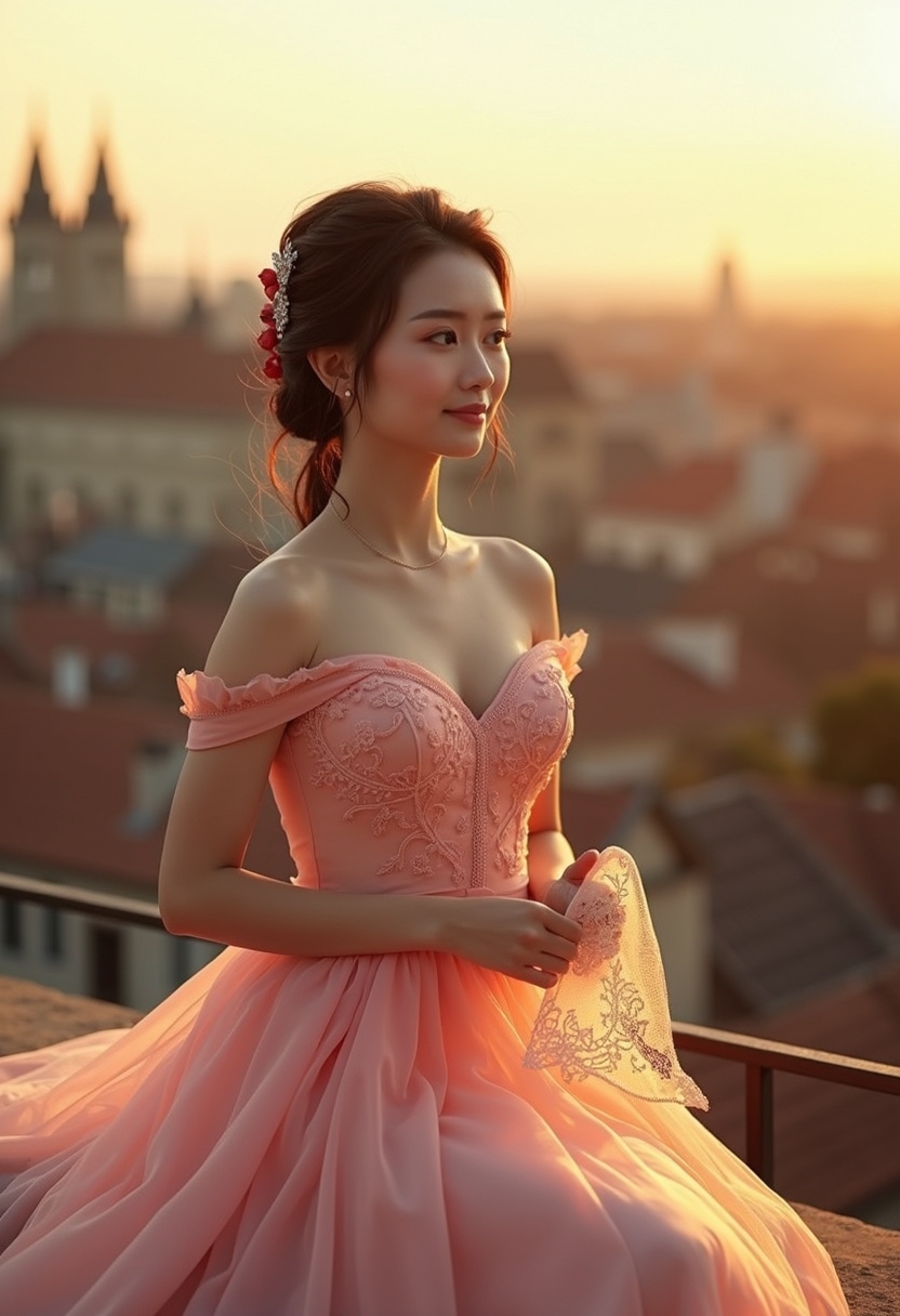 Інжу өрнегімен тігілген нәзік қызғылт көйлек киген қалыңдық күн батқандағы көрінісі бар балконда отыр. Шашы бос түйілген, қолында жұқа шілтер орамал. Артында тарихи ғимараттардың шатырлары. Күн батқан жарық, романтика мен жылылыққа акцент.
