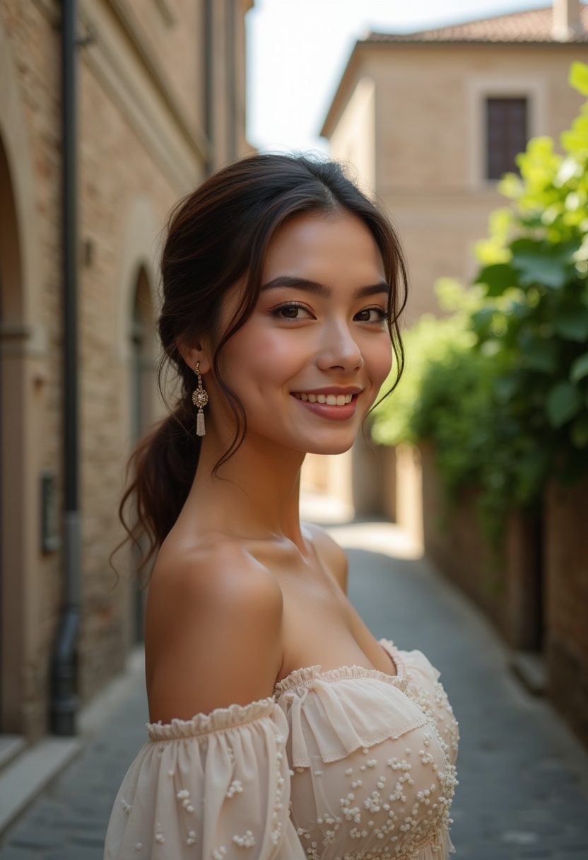 Жасыл төбелермен қоршалған жіңішке тас жолда, алыстан көрініп тұрған ортағасырлық қамалы бар фотосессия. Итальян стилінде киінген әйел, ашық көк көйлегімен, жеңіл жел соққан сайын тербеліп тұр. Оның ұзын шаштары жұмсақ толқындармен желге ілесіп ағуда. Әйелдің бетіне жылы күн сәулесі түседі, көзі...