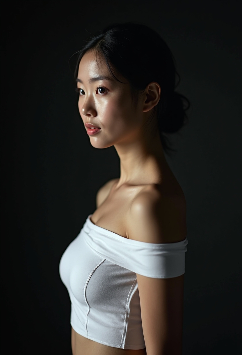 Сұрғылт-беж түсті минималистік көйлек киген әйел қараңғы студияда тұр, оның жүзі жоғарыдан түскен көгілдір жұмсақ жарықпен жарықтандырылған. Жарық аздап шашырап, тұманды әсер береді. Жарық нәзік, сызықтардың жұмсақтығын көрсетеді.