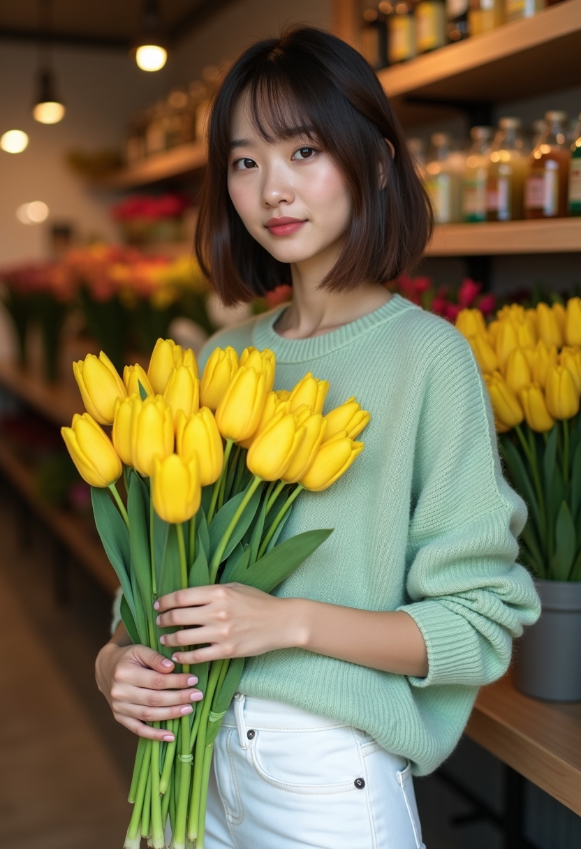 Каре шашты қыз гүл дүкенінің фонында тұр. Ол ақ джинсы мен ашық жасыл свитер киген. Қолында үлкен сары қызғалдақтар шоғы бар.
