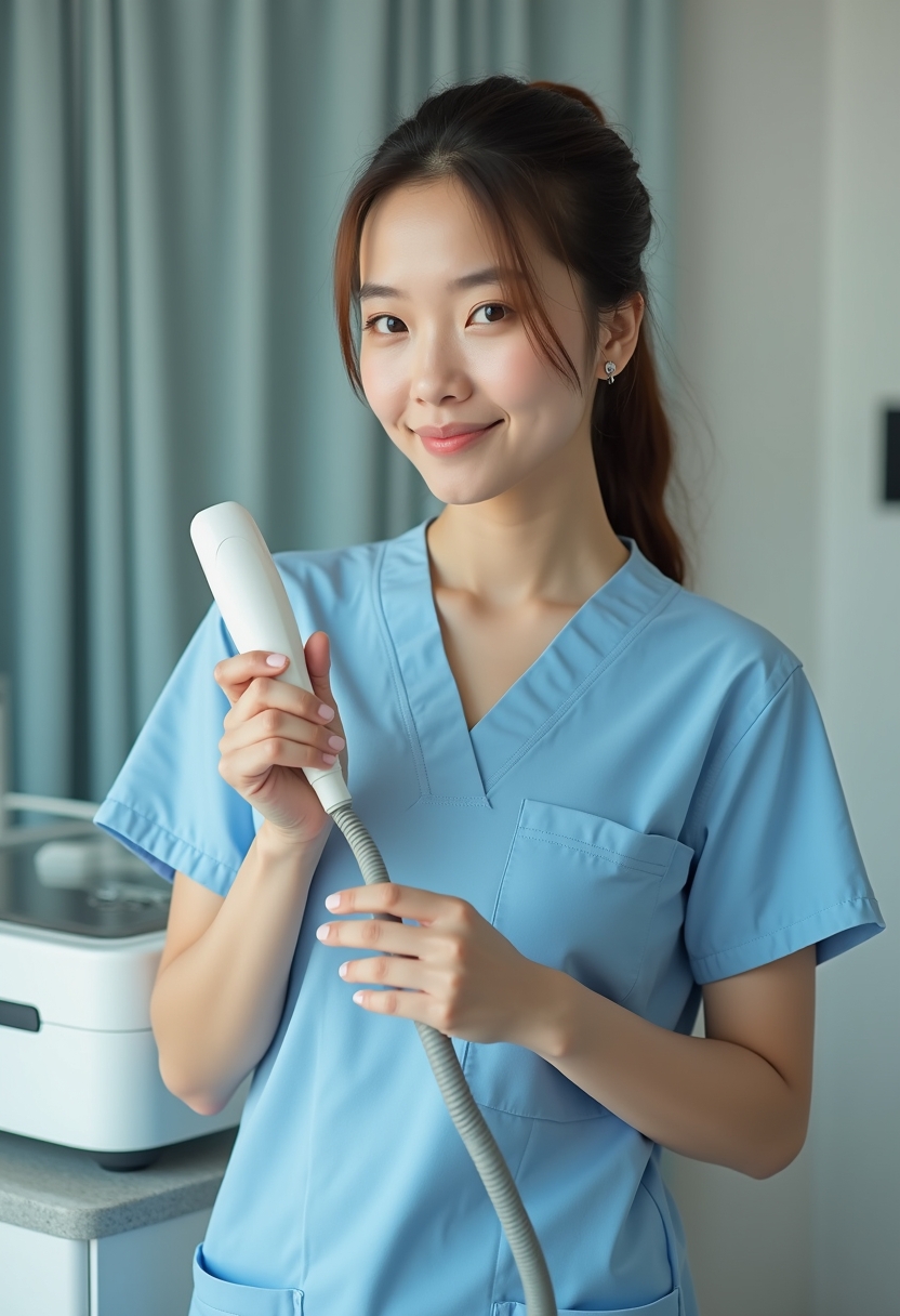 Кәсіби формадағы косметолог ультрадыбыстық тазарту аппаратының жанында тұр, манипула ұстап, тура камераға қарап тұр.
