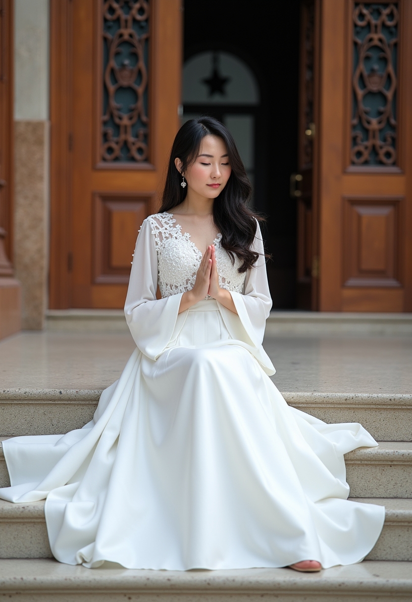 Кең жеңді ақ көйлек киген қалыңдық үлкен сарайдың баспалдағында отыр, қолдарын дұға тәрізді біріктірген, көзі төмен қарап тұр. Артында ойылған есіктер мен биік терезелер. Табиғи жарық, ойлы бейнесіне екпін береді.