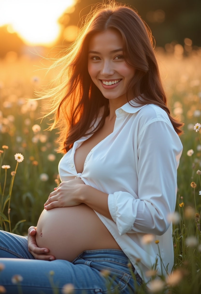Кешкі күннің алтын нұрына бөленген жүкті әйел көк шалғында отыр. Ол құрсағын мейіріммен сипап, көздері үміт пен қуанышқа толы. Жел баяу шашын тербетіп, айналада нәзік жабайы гүлдер жайқалып тұр.
