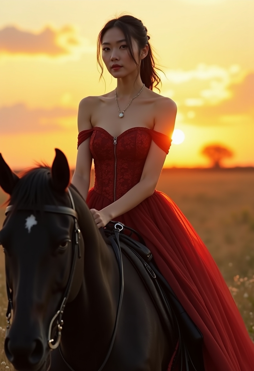 Кешкі сәнді көйлек киген әйел қара атқа мініп отыр, айналада кешкі күн батуы мен ашық алқап көрінеді.