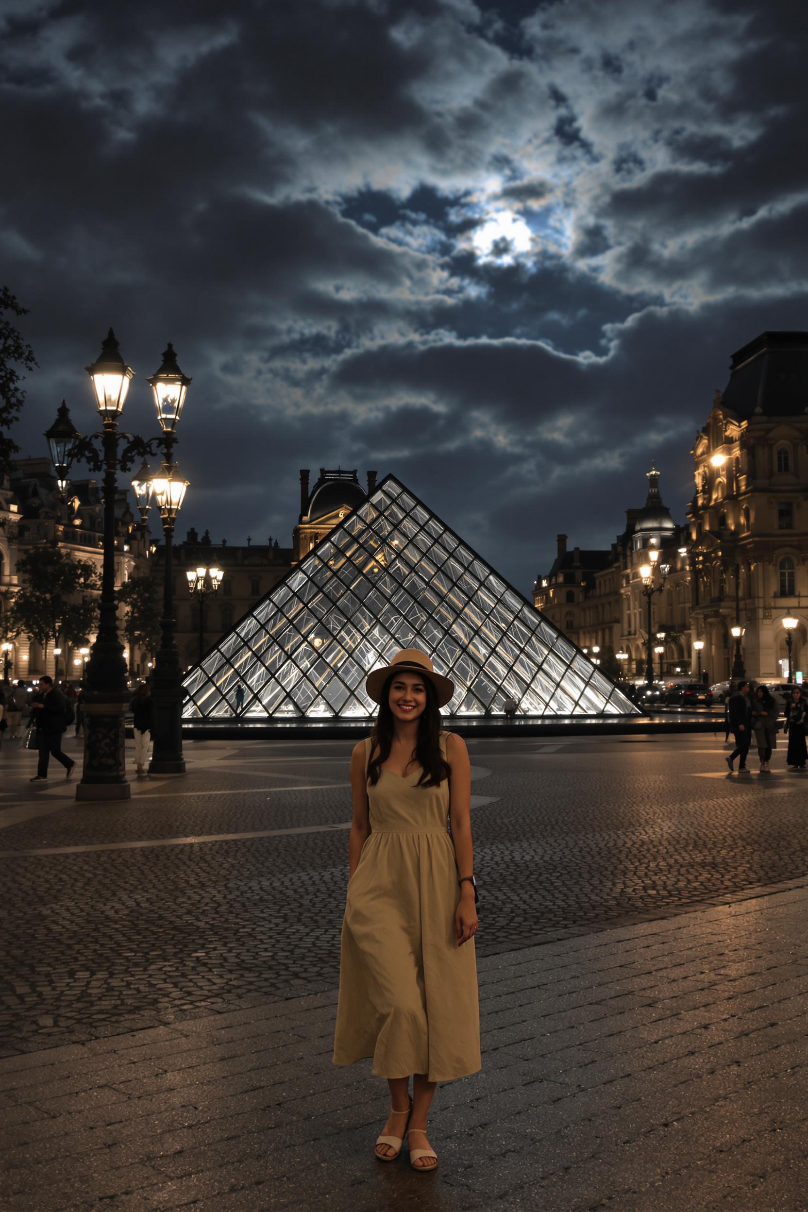 Кешкі уақыттағы Париж көшесінде суретке түсу, артында Шам жағылған Лувр мұражайы керемет көрінеді. Ортаңғы кадрда қарапайым көйлек пен шляпа киген адам камераға қарап күлімдеп тұр. Бұлттардағы ай жарығы айналаны жұмсақ жарықпен толтырып, атмосфера романтикалы және жұмбақ.