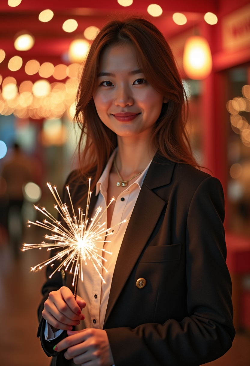 Киім үлгісі сәнді шалбарлы костюмдегі әйел мерекелік хлопушка ұстап, күлімсіреп тұр, артында әдемі безендірілген мерекелік аймақ