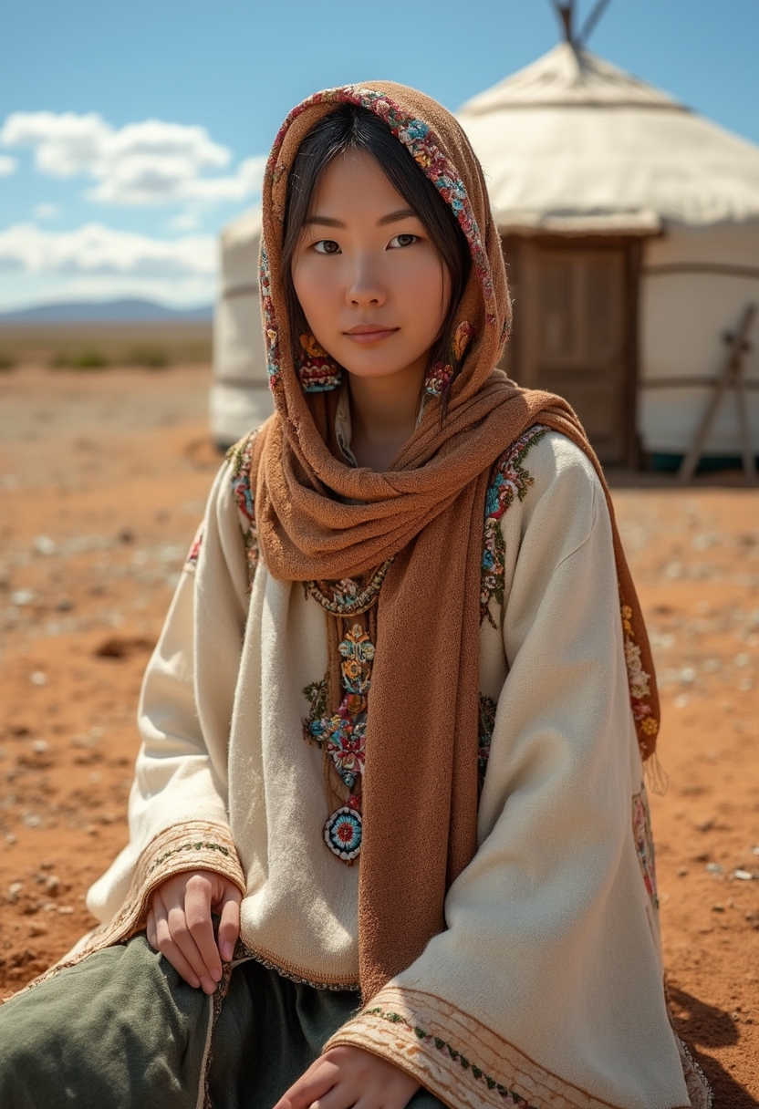 Өз бейнеңізде көруКиіз үйдің алдында дәстүрлі киім киген жас әйел отыр, оның үстінде оюлы шапан, бастары әшекейлі орамалмен жабылған. Шағыл құмдар мен көк аспан көрініп тұр, ал әйелдің жанары камераға назар аударған.