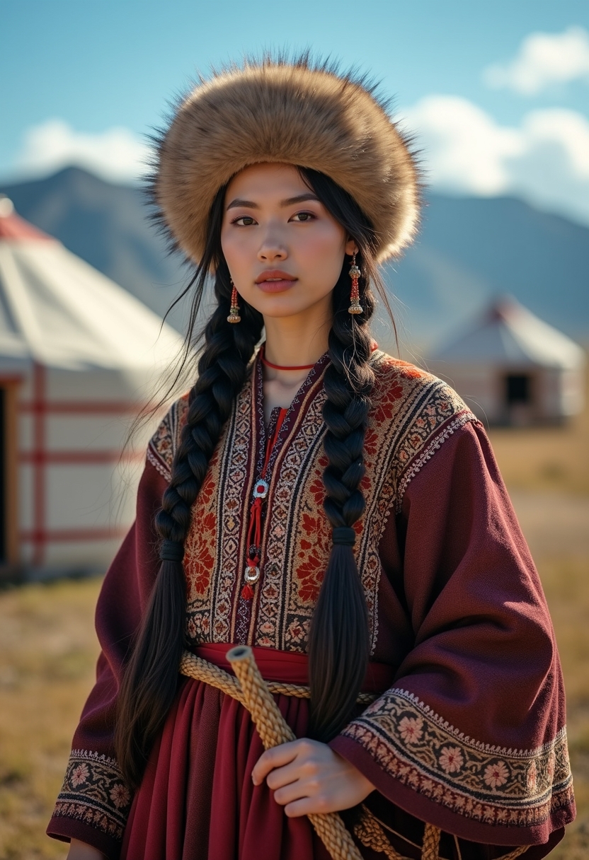 Өз бейнеңізде көруДаланың ортасында киіз үй жанында, дәстүрлі киім киіп, көк аспан астында тұрған адам. Жібек желкесін самал жел тербеп, ол камераға тіке қарап тұр. Айналадағы кең жазық дала мен шаңған дала гүлі көрініп тұр, табиғаттың мәдениет үйлесімі байқалады.