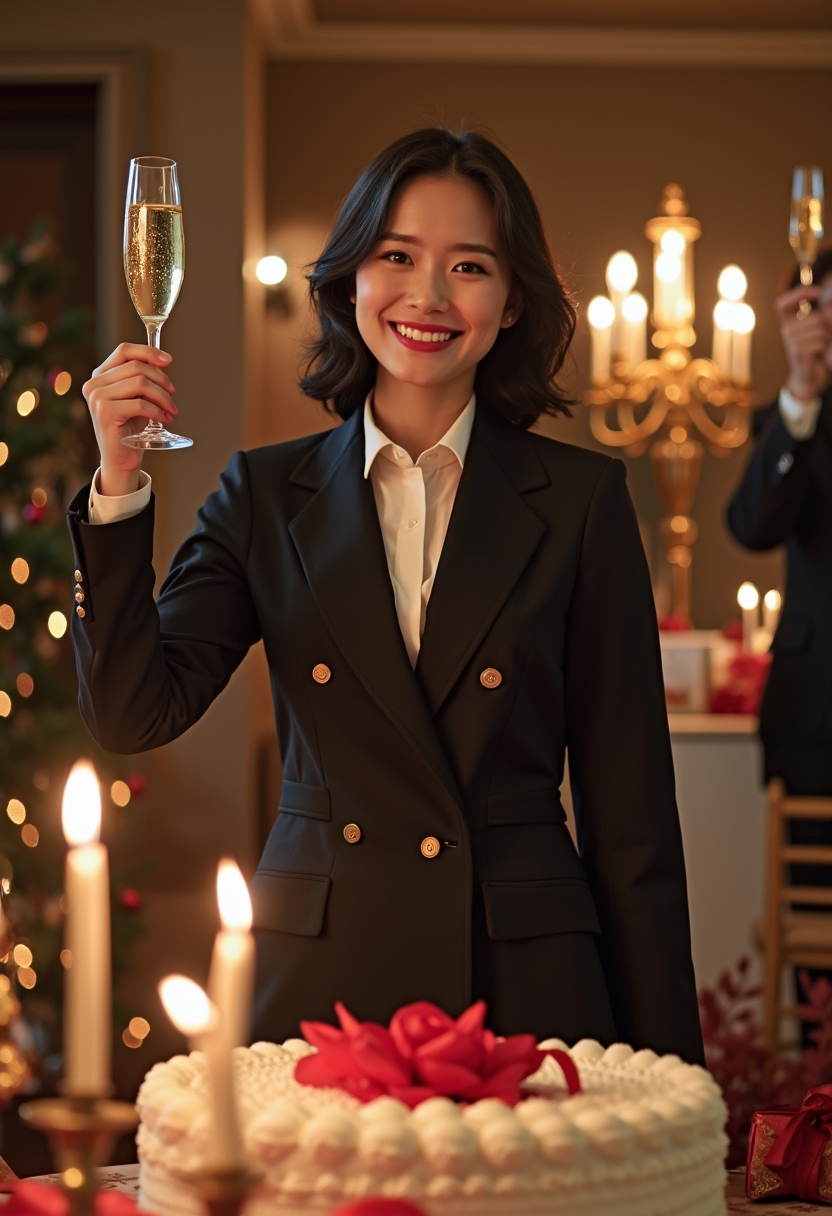 Классикалық костюм киген әйел мерекелік дастарханның алдында тұр, торт пен сыйлықтар бар, шампан бокалын көтеріп тұр, айналасында мерекелік қалпақтағы қонақтар