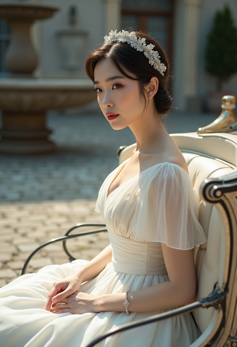 Классикалық ақ көйлек киген қалыңдық ақ аттарға жегілген винтаж арбада отыр. Қолдары көйлек етегінде, көзі жанға бағытталған. Артында тас төселген аула мен фонтан. Күндізгі жарық, аристократ бейнесіне екпін береді.