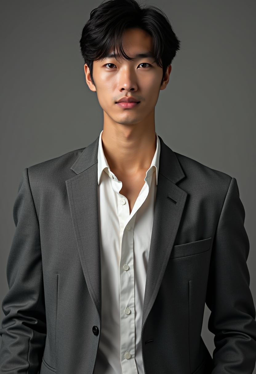 Классикалық сұр пиджак пен галстуксыз жейде киген ер адам кәсіби студиялық жарықта, камераға қарап тұр