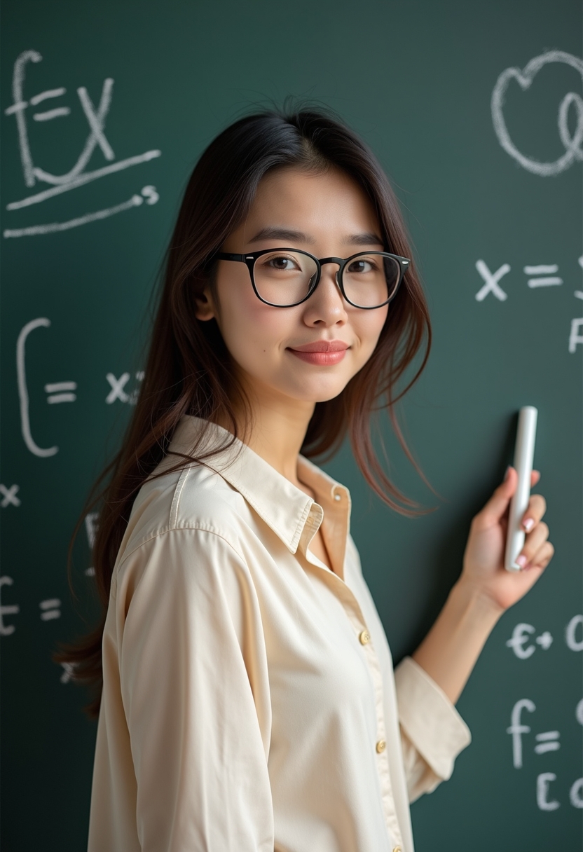 Көзілдірік таққан, ашық түсті блузка киген әйел тақта жанында бор ұстап тұр, тақтада формулалар жазылған. Ол камераға жеңіл, бірақ сенімді жымиып қарайды. Жақын жоспар, зеректік пен зейінге акцент.