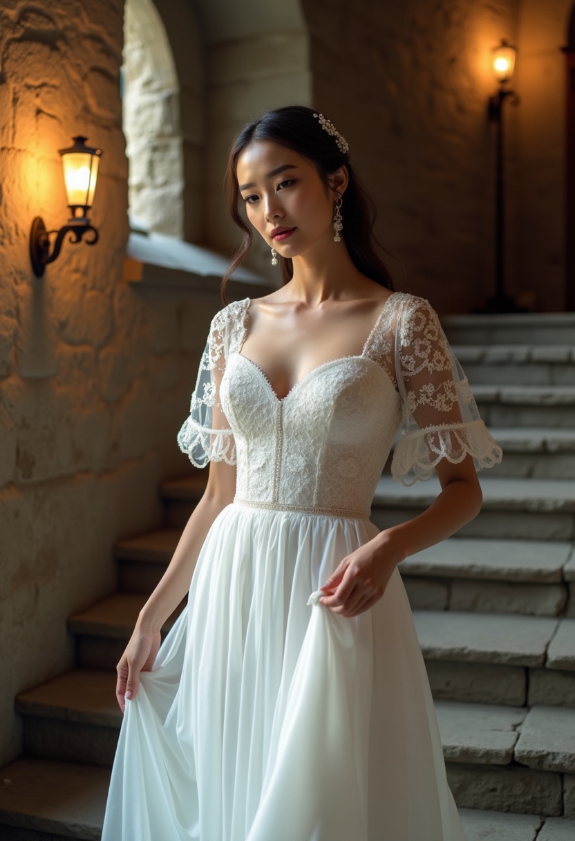 Кружев жеңі бар ақ көйлек киген қалыңдық ескі қамалдың баспалдағымен көйлегінің етегін ұстап жүріп келеді. Көзі төмен бағытталған, артында тас қабырғалар мен көне шамдар. Жылы жарық, сәттің салтанатын жеткізеді.