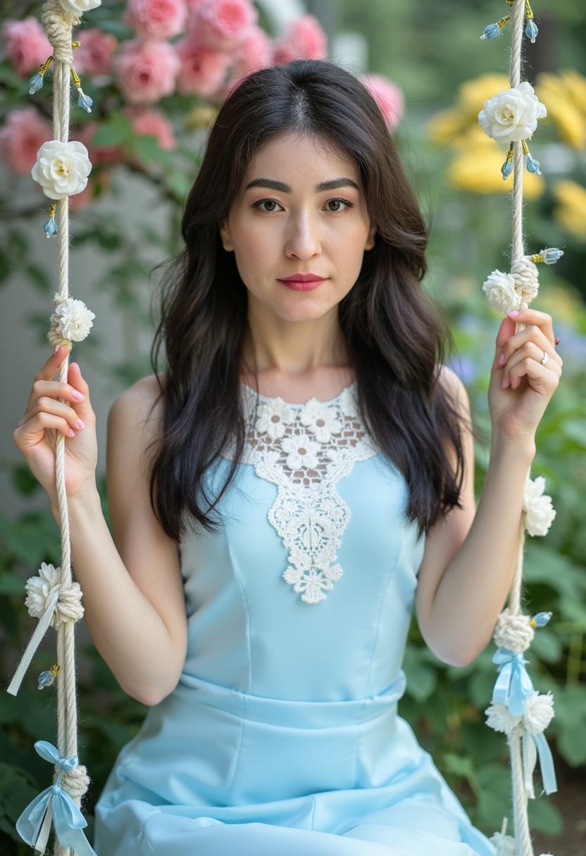 Кружевті жағасы бар ашық көгілдір көйлек киген әйел гүлдермен безендірілген әткеншекте отыр. Оның қолдары әткеншектің жіптерін ұстап, көзі тікелей камераға бағытталған. Артында гүлдеп тұрған бақ көрінеді. Жарық жұмсақ, екпін оның нәзіктігі мен романтикалық бейнесіне қойылған.