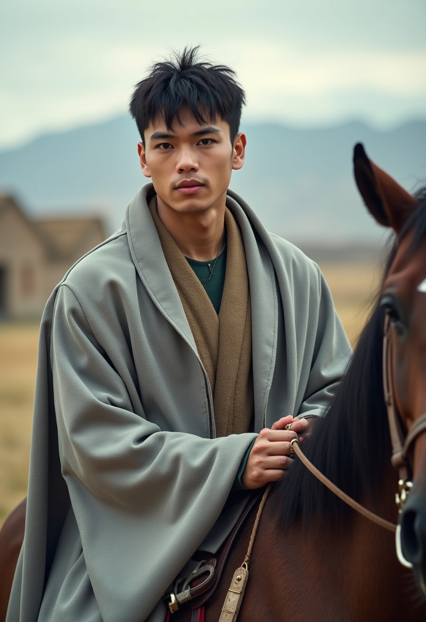 Ұзын дәстүрлі шапан киген ер адам кең далада тұр. Ол камераға тіке қарайды, оның жанында шексіз кең дала мен алыстағы таулар көрінеді. Жарық күн аясында көк аспан мен қойылған бұлттар бейнеленген, ал оның көзінде көшпенді рухы тербелген.