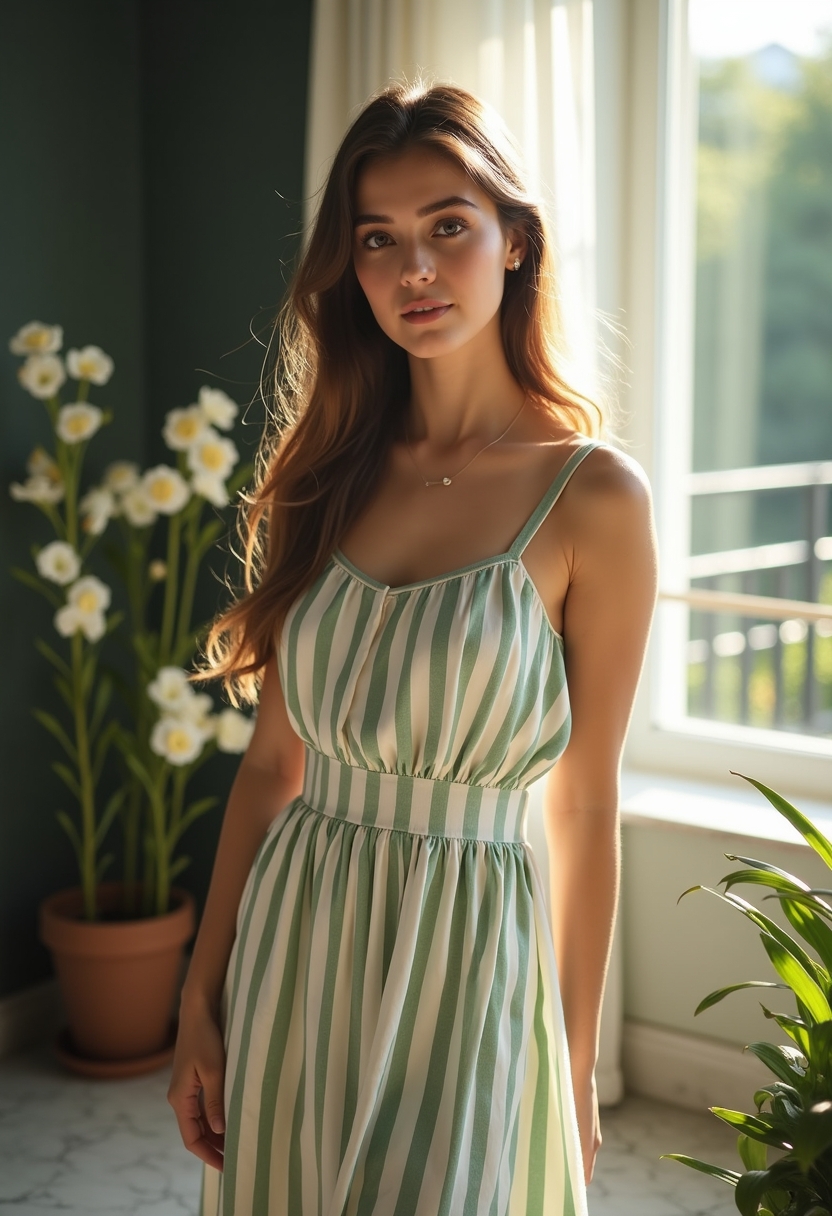 Күн сәулесі жұмсақ түсетін бөлмеде, ақ-жасыл жолақты көйлегімен жас қыз камераға күлімдеп қарайды. Жанында гүлді өсімдік, артқы жағында терезеден кірген жарық көрінеді. Полароид стилі, мәрмәр еден және қабырға қою түсте.