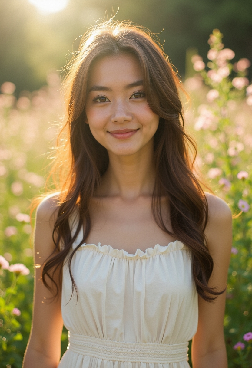 Күн сәулесінің жылы шуағы астында гүлзарлы саябақта тұрған жас әйел. Ол қарапайым ақ көйлек киіп, камераға тіке қарап, нәзік жымиып тұр. Артында гүлдер мен жасыл-желек үйлесімді көрінеді, полароид стилі ескере отырып.