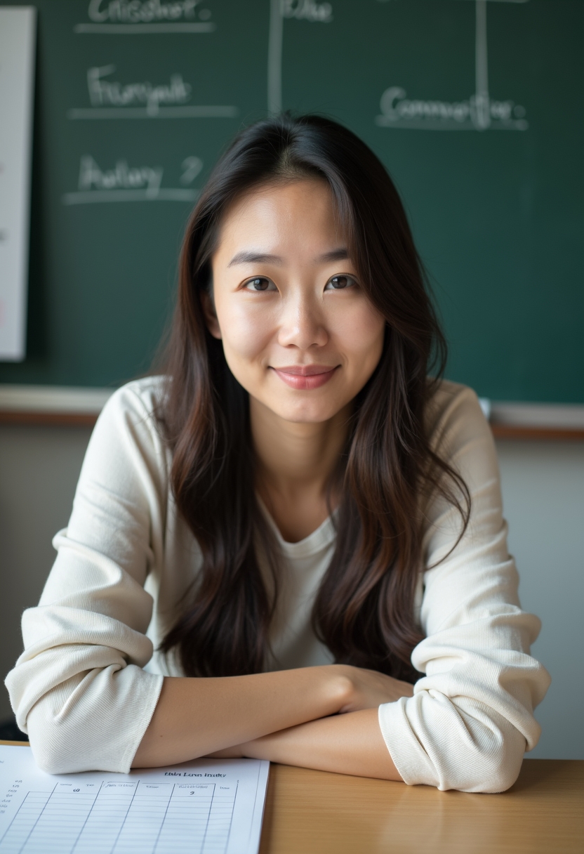 Көзілдірік таққан, ашық түсті блузка киген әйел тақта жанында бор ұстап тұр, тақтада формулалар жазылған. Ол камераға жеңіл, бірақ сенімді жымиып қарайды. Жақын жоспар, зеректік пен зейінге акцент.