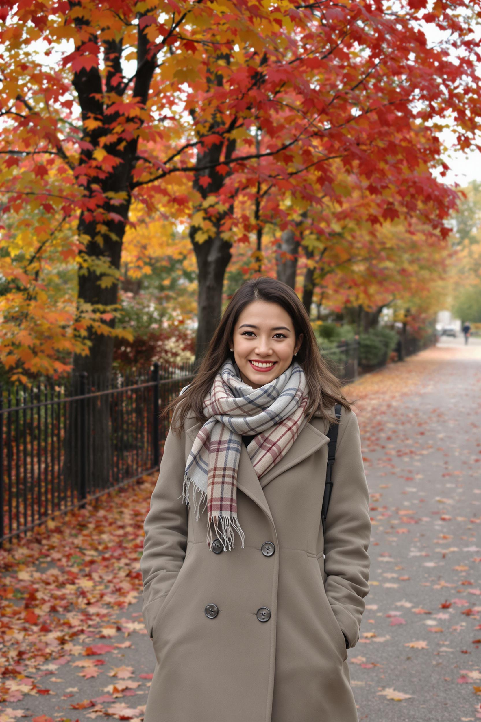 Күзгі Париж саябағының гүлденген аллеясында жүру, артында түсті жапырақтармен көмкерілген ағаштар. Ортаңғы кадрда сәнді шарф пен пальто киген адам камераға жылы жымиып қарап тұр, айналасында түсі қызыл және алтын болған жапырақтар төгілген. Атмосфера жайлы және романтикалық.