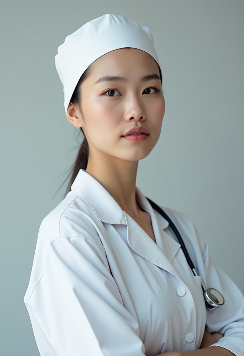 Медициналық форма киген әйел-дәрігер, минималды макияжбен және сенімді көзқараспен, ашық сұр фонда ірі жоспар, тура камераға қарап тұр. Басында цилиндр пішінді ақ қалпақ