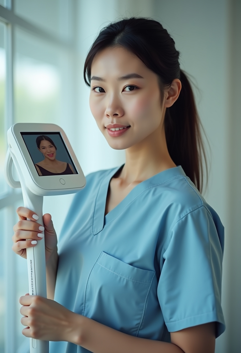 Медициналық формадағы косметолог фотоэпиляция аппаратының жанында тұр, оның тұтқасын ұстап, тура камераға қарап тұр.