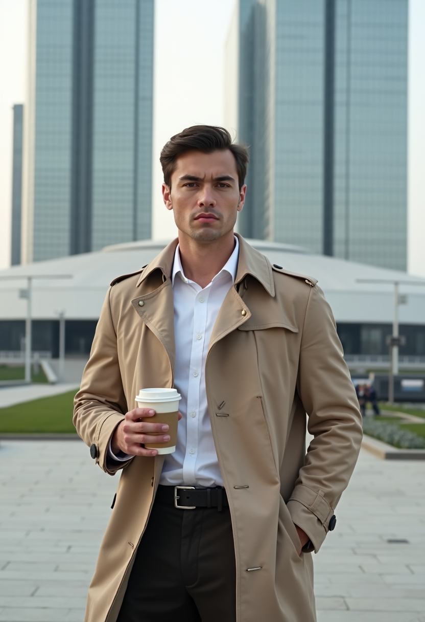 Астанадағы Бәйтерек монументі алдында ер адам классикалық көктемгі тренч пен ақ жейде киіп тұр. Ол сенімді әрі стильді бейнеде, қолында кофе кесесі бар. Камераға қараған көзқарасы байыпты, артқы фонда заманауи биік ғимараттар мен ашық аспан көрінеді.