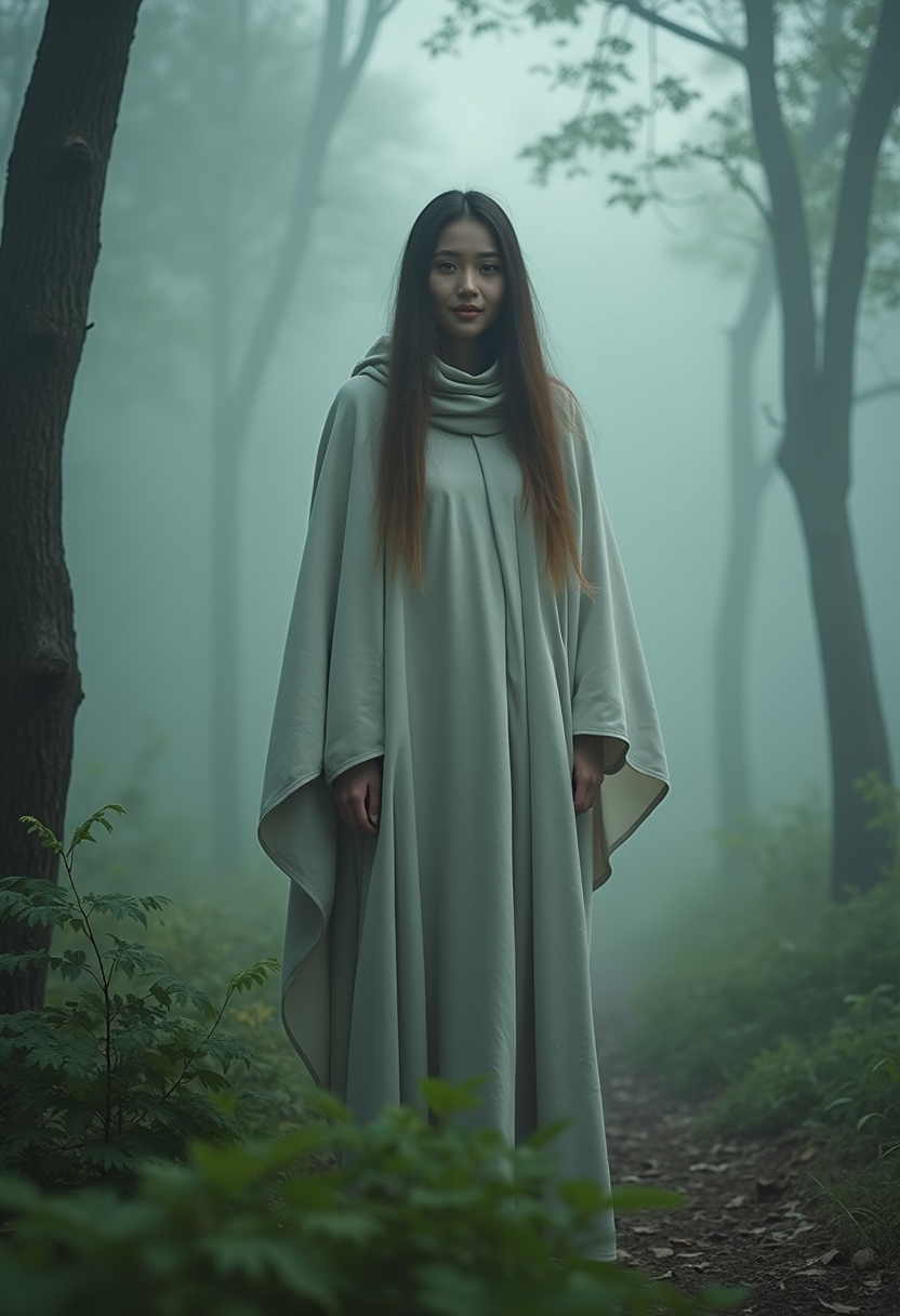 Мұнарлы орманның ішінде нәзік реңкте ұзын жамылғысы бар әйел тұрып, камераға тіке қарайды. Айналасын қалың тұман қоршап, жұмбақ атмосфераны туғызуда. Ол сәл жымиып, нәзік жарық пен тұманды шағылыстыра оқиғаның тереңдігін айқындап тұр.
