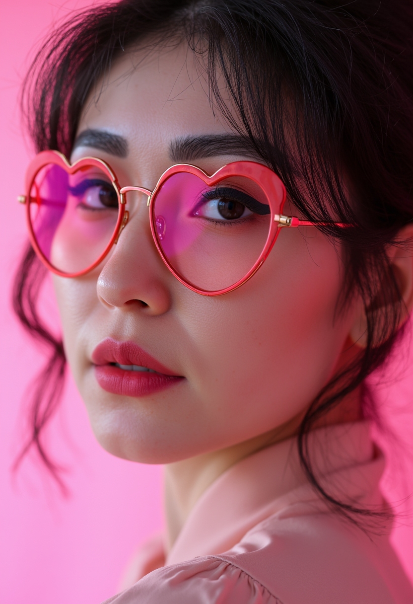 Мұрнында қызғылт линзалы жүрек пішінді көзілдірік, жарықты шағылыстырады, ал оның маңғаз қарасы бейнеге жұмбақтық береді. 8K ажыратымдылықтағы ультрареалистік ірі пландағы портрет: көз қабақтарындағы айқын қызғылт бояу, әсерлі қара лайнер, ұзын әрі қалың кірпіктер және жұмсақ қызғылт еріндер. Артқы фонда — бейнесімен үйлескен қанық қызғылт түс. Оның қарасы тікелей камераға бағытталған, сенімділік пен сымбаттылықты білдіреді. Тері інжу тәрізді жылтырап, нәзік гламур әсерін тудырады. Үйлесімді, көз тартарлық, нағыз шедевр.