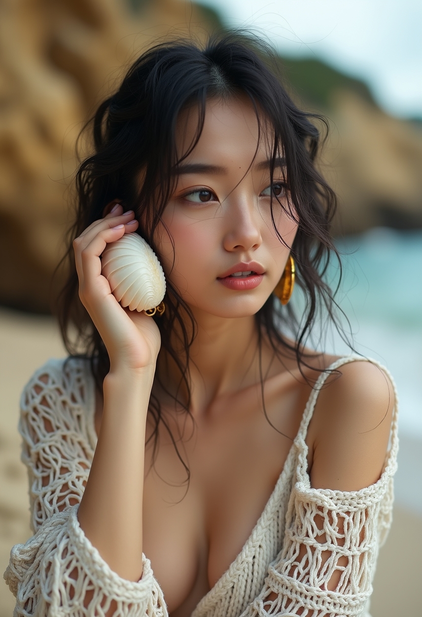 Ол ақ қабыршақты құлағына таяп тұр. Шашы суланған, көзі алыста. Артқы фонда — суланған жартастар мен теңіз. Ақ тоқылған көйлек, алтын сырғалар. Түстер — алтын, сарғыш, ақ.