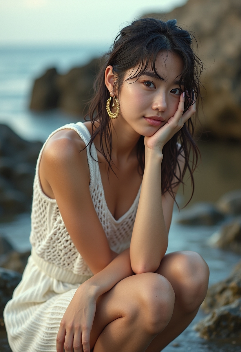 Ол бүгіліп отыр, бүйірден түсірілген сурет. Басы тізесінде, қолдары аяқтарын құшақтап тұр. Шашы суланған, камераға қарап тұр. Артқы фонда — суланған жартастар мен теңіз. Ақ тоқылған көйлек, алтын сырғалар. Түстер — алтын, сарғыш, ақ.
