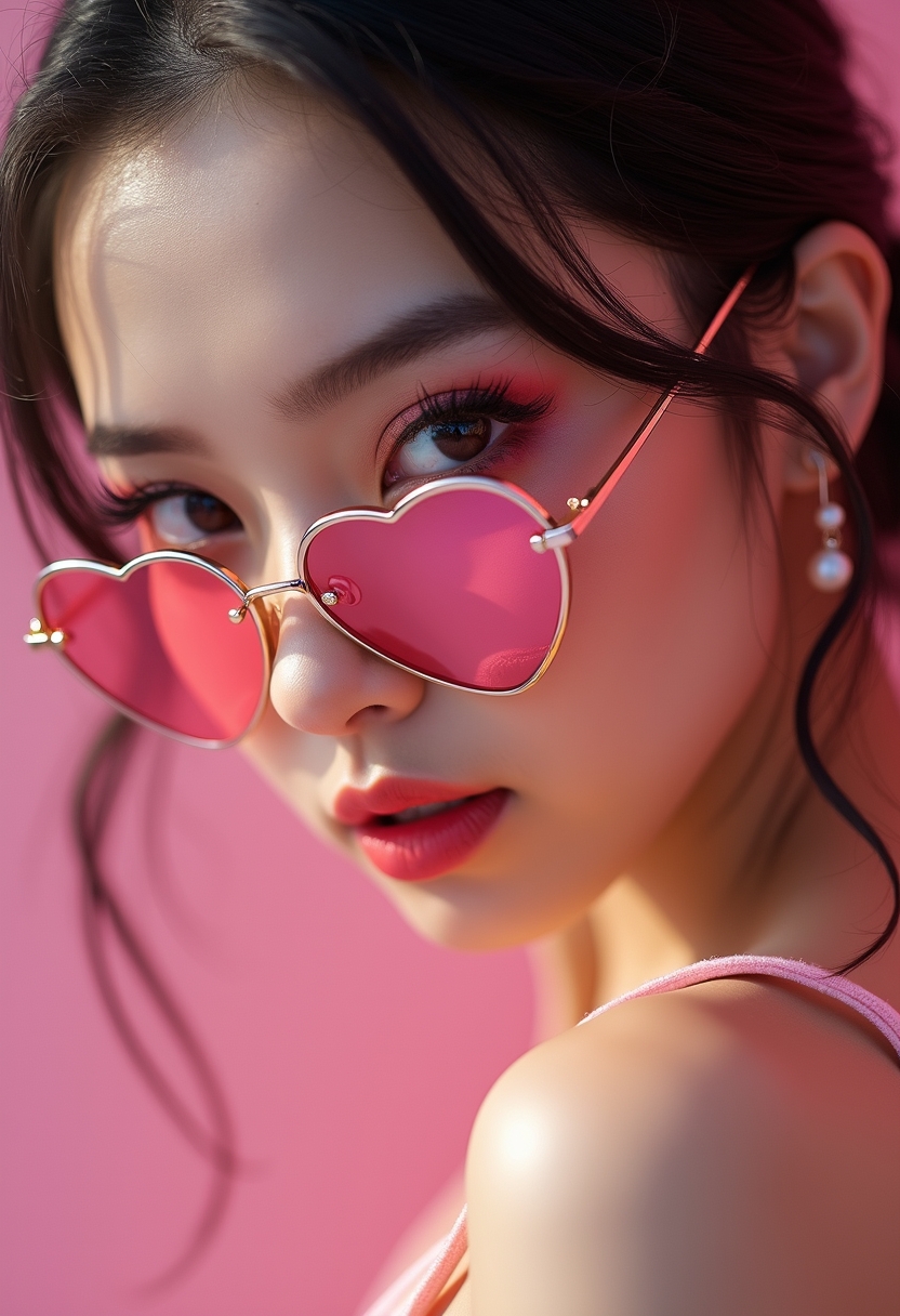 Басын сәл кейін шалқайтып, аузын сәл ашып, ол еркін әрі еліктіргіш көрінеді. Жүрек пішінді қызғылт линзалы көзілдірігі жарықты шағылыстырады, қарасы камераға бағытталған. 8K ажыратымдылықтағы ультрареалистік ірі пландағы портрет: көз қабақтарындағы айқын қызғылт бояу, әсерлі қара лайнер, ұзын әрі...