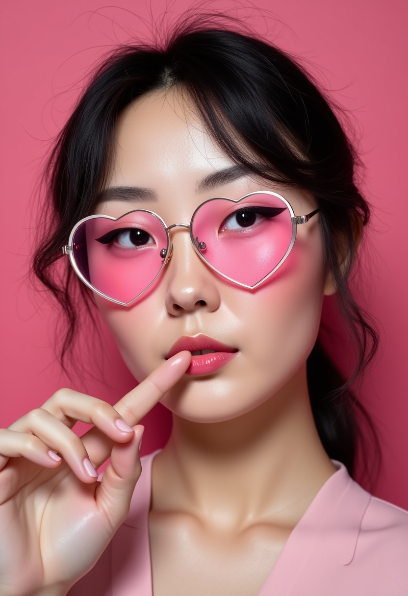 Ол саусағын ерініне қойып, жұмбақ қылық білдіреді. Мұрнында жүрек пішінді қызғылт линзалы көзілдірік, ол жарықты шағылыстырады. 8K ажыратымдылықтағы ультрареалистік ірі пландағы портрет: көз қабақтарындағы айқын қызғылт бояу, әсерлі қара лайнер, ұзын әрі қалың кірпіктер және жұмсақ қызғылт еріндер. Артқы фонда — бейнесімен үйлескен қанық қызғылт түс. Тері інжу тәрізді жылтырап, нәзік гламур әсерін тудырады. Үйлесімді, көз тартарлық, нағыз шедевр.
