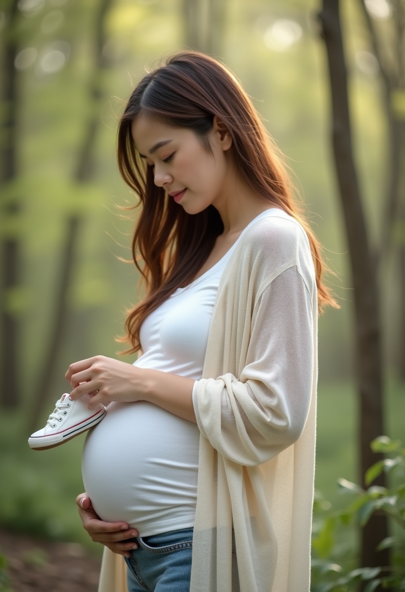 Орман алқабында жүкті әйел ақшыл жамылғыға оранып, қолында кішкентай нәресте аяқкиімін ұстап тұр. Оның жүзінде ана махаббатының шексіз мейірімі көрініп, айналасын көктемгі гүлдердің нәзік хош иісі қоршап тұр.