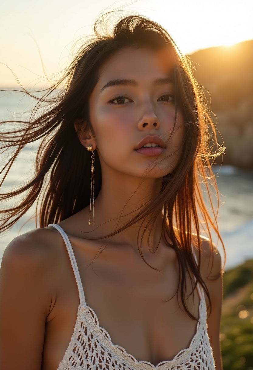 Профильде жақыннан түсірілген сурет. Ол тұр, жел желкесіне соғып тұр, шашы желбіреп, ойлы көзқарас. Күн батуының сәулесі шашының арасынан өтеді. Артқы фонда — суланған жартастар мен теңіз. Ақ тоқылған көйлек, алтын сырғалар. Түстер — алтын, сарғыш, ақ.