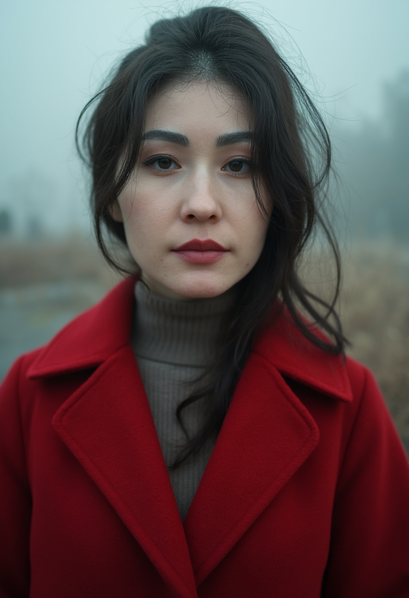 Қалың тұман арасында қызыл пальто киген қыз. Оның көзі тікелей камераға қаратылған, тұманның жұмбақ жылуы айналасын толтырады. Тұманнан отырып, табиғаттың құшағында екенін сездіреді.