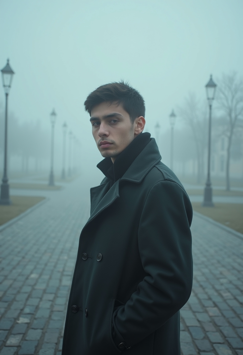 Қалың тұманның қоюлығына оранған саябақта жас жігіт, қара пальто киген, әр қадамда тұманды кесіп өтуде. Оның қатулы қабағы бір орында, ал көздері тікелей камераға қадалған. Айналасын тұманның жұмбақ пердесі жапқан, тек жасыл ағаштың көлеңкелері анық байқалады. Табиғи жарық пен тұманның бірігуі...