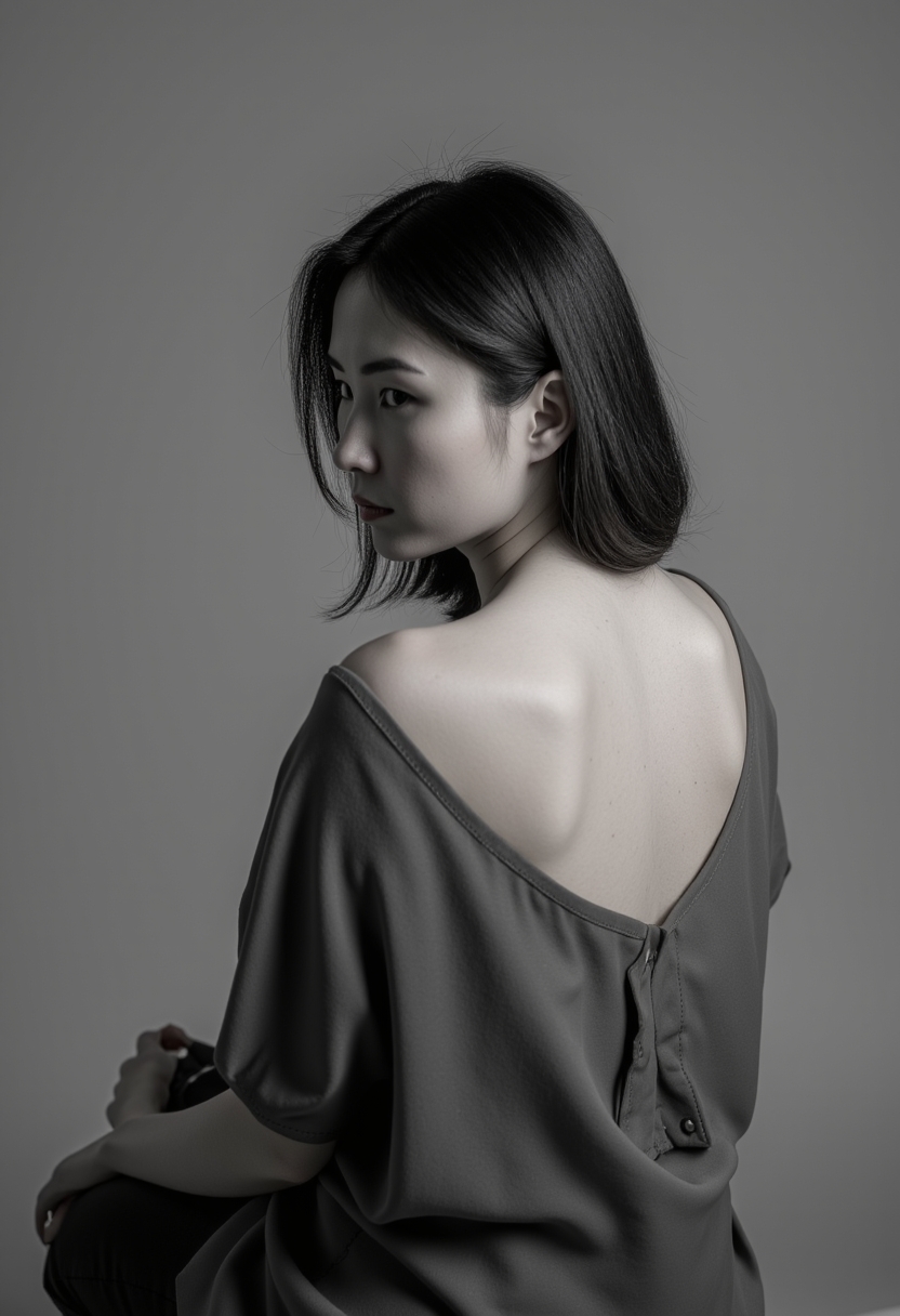 Қара-ақ фотосурет: Арқасы ашық жейде киген әйел үстелдің шетінде отыр, иығы арқылы камераға қарап тұр, жарық иық сызығын ерекшелейді.