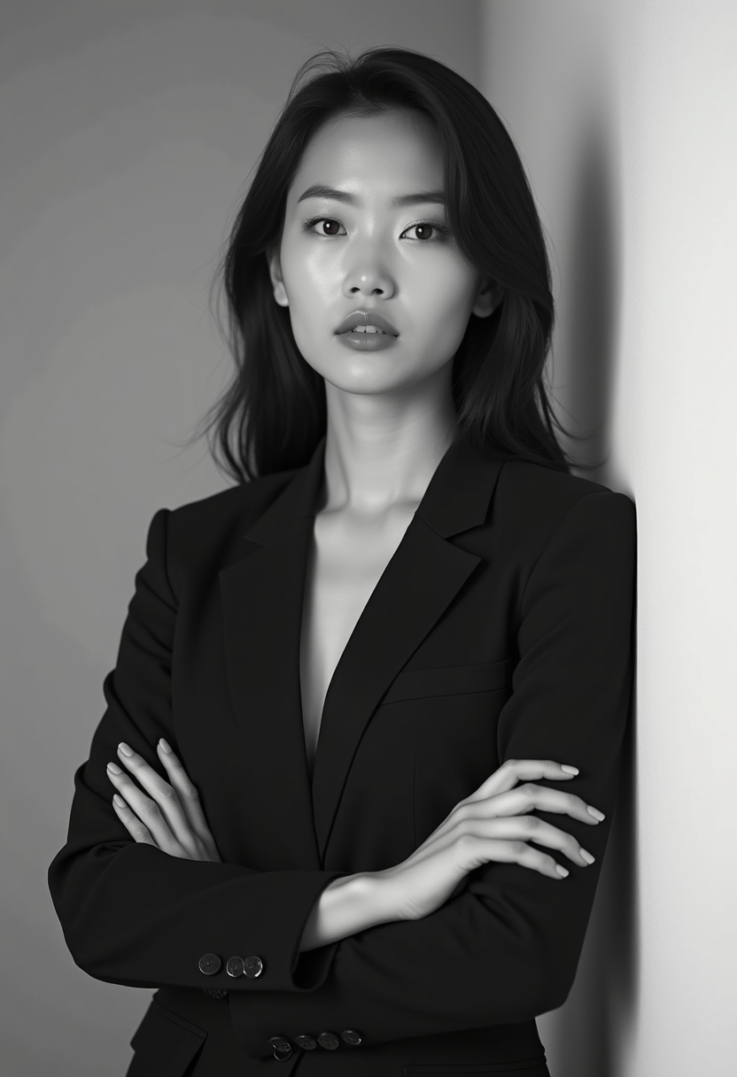 Қара-ақ фотосурет: Костюм киген әйел қабырға жанында тұр, қолдары кеудесінде айқасқан, байсалды көзқараспен камераға қарап тұр, студиялық фон бейтарап.