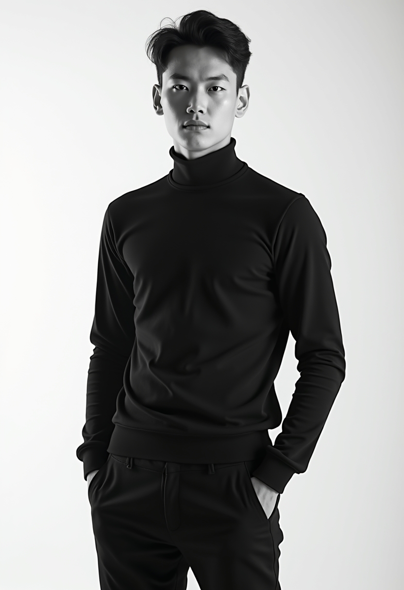 Қара-ақ фотосурет: Водолазка мен шалбар киген ер адам қолдарын төмен түсіріп, тура камераға қарап тұр, фон минималистік және ашық.