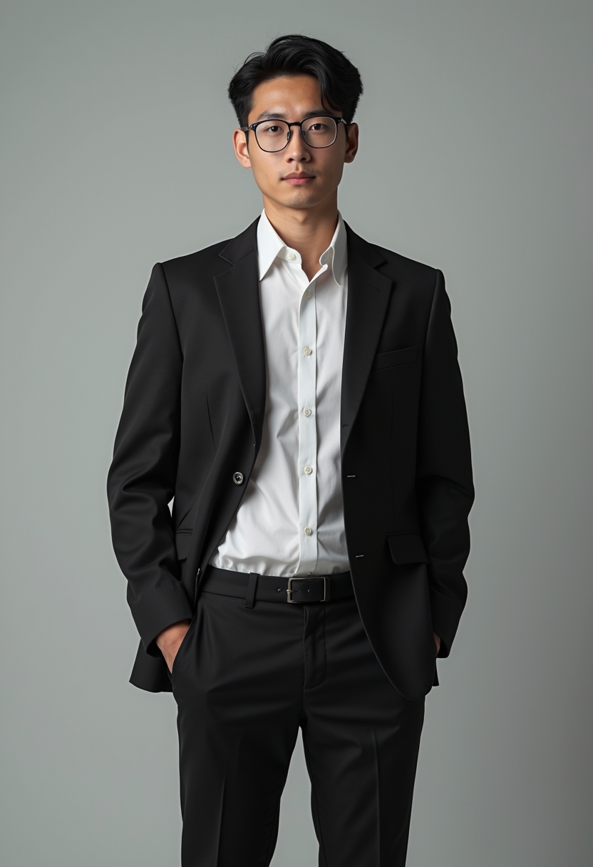 Қара костюм мен ақ жейде киген ер адамның ірі жоспары, бейтарап ашық-сұр фонда, тура камераға қарап тұр