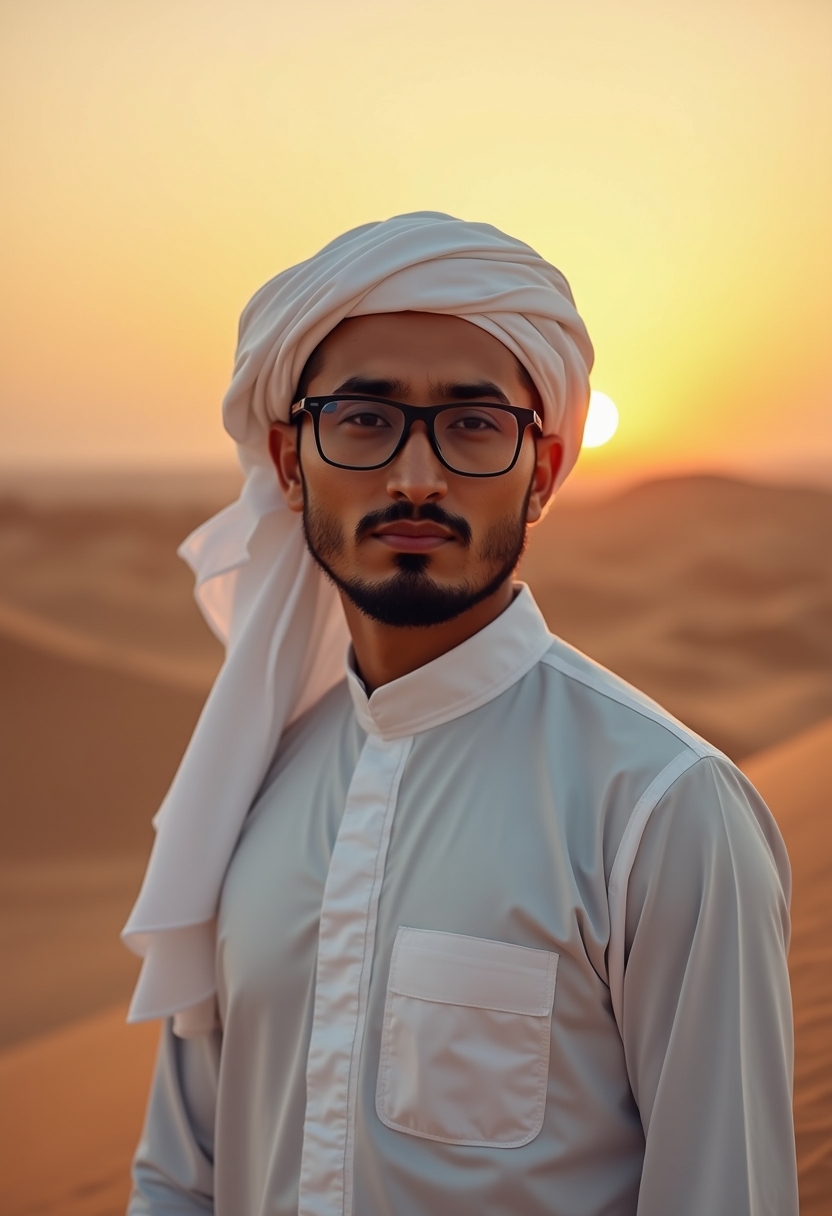 Жас жігіт ақ түсті дәстүрлі араб киімінде (кандура) және басына куфия орамалын таққан күйі құмды төбешікте тұр, артында шексіз шөл дала мен күннің батуы байқалады, жүзі камераға тіке қараған, келбеті сабырлы әрі салмақты.